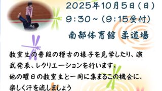 各教室 令和7年 合気道教室交流会 開催 2025年10月5日(日)南部体育館にて教室交流発表会が行われました。昨年に続き、2回目の開催となる今年は、準備運動から始まり、受身の練習、そして東西に分かれての演武合戦、師範の模範演武を行いました。他教室の生徒、指導員が集まり、良い交流の... 各教室連盟連絡事項