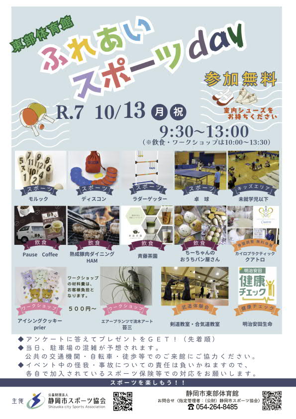 東部体育館にて、どなたでも無料で参加できるイベントを開催します。今年も、静岡市スポーツ推進委員会の協力により「モルック」「ディスコン」「ラダーゲッター」といったニュースポーツ体験を実施します。そのほか、卓球コーナーやキッズエリア、剣道・合気道教室の体験・見学など、多彩なプログラムをご用意。さらに、明治安田生命静岡南営業所による「健康チェックコーナー」、骨盤調整の無料体験、ワークショップや飲食販売ブースもあり、一日を通して楽しめる内容となっています。小さなお子様からご年配の方まで、幅広い世代の方が気軽に参加できるイベントです。ご家族やご友人をお誘い合わせのうえ、ぜひ東部体育館へお越しください。皆さまのご来館を心よりお待ちしております。(室内履きシューズを必ずお持ちください。)